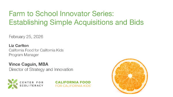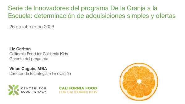 The Farm to School Innovator Series provides virtual gatherings for farm to school leaders focused on building resilient school food systems in California. Join us to connect with peers and take the next step toward more fresh, local school meals. All events include live Spanish language interpretation by Community Language Cooperative.